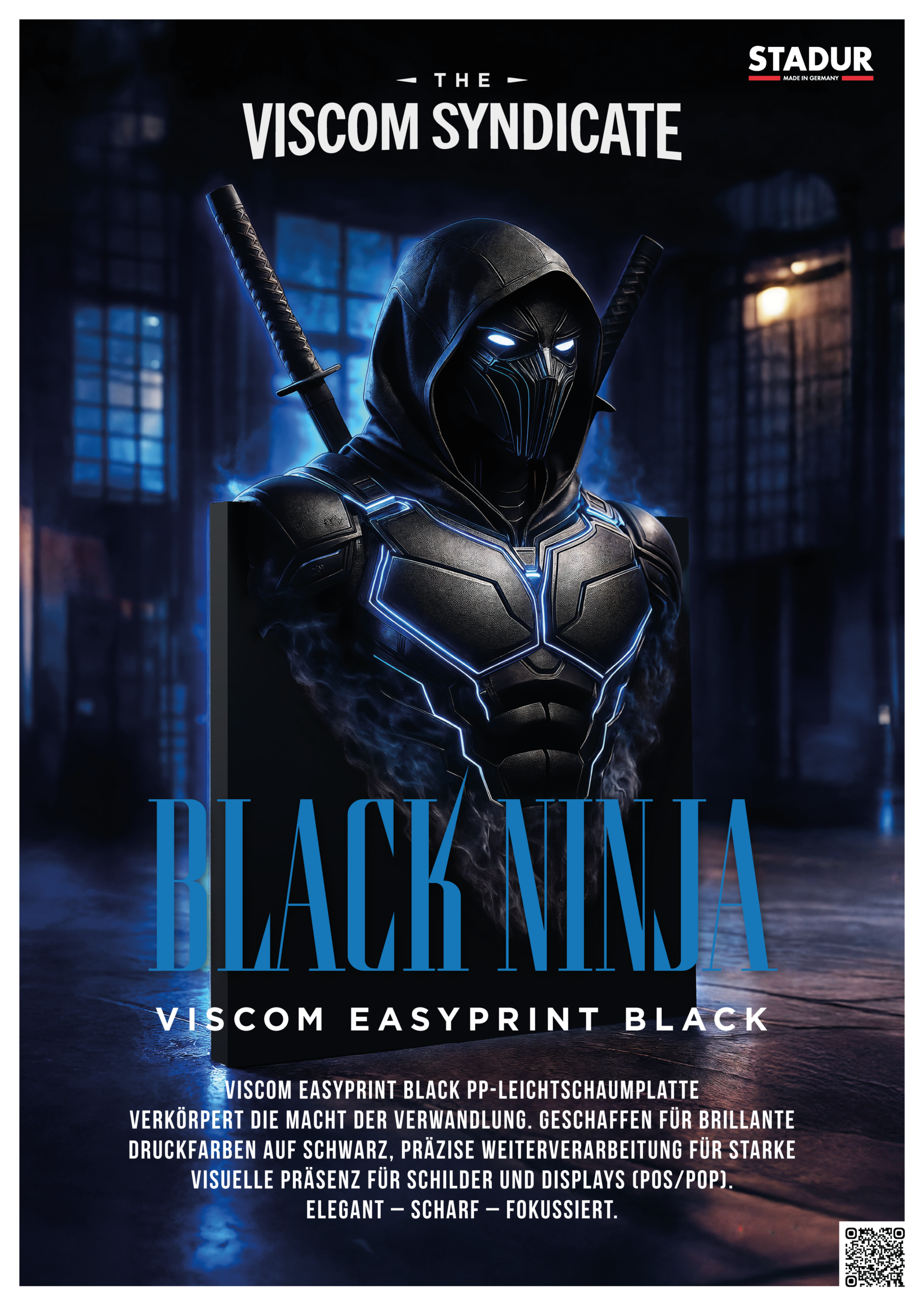 VISCOM EASYPRINT BLACK PP-Leichtschaumplatte verkörpert die Macht der Verwandlung. Geschaffen für brillante Druckfarben auf schwarz, präzise Weiterverarbeitung für starke visuelle Präsenz für Schilder und Displays (POS/POP).
